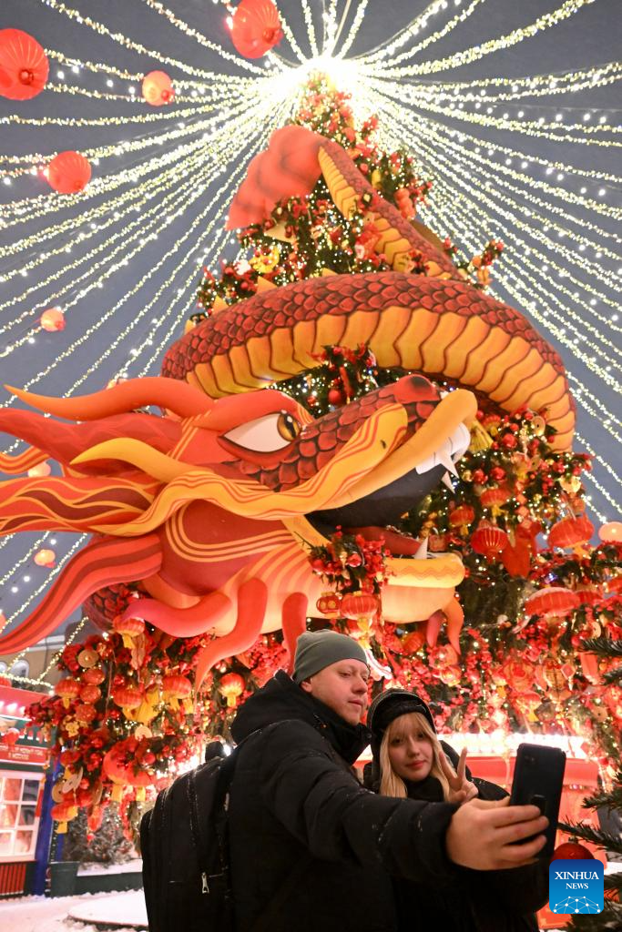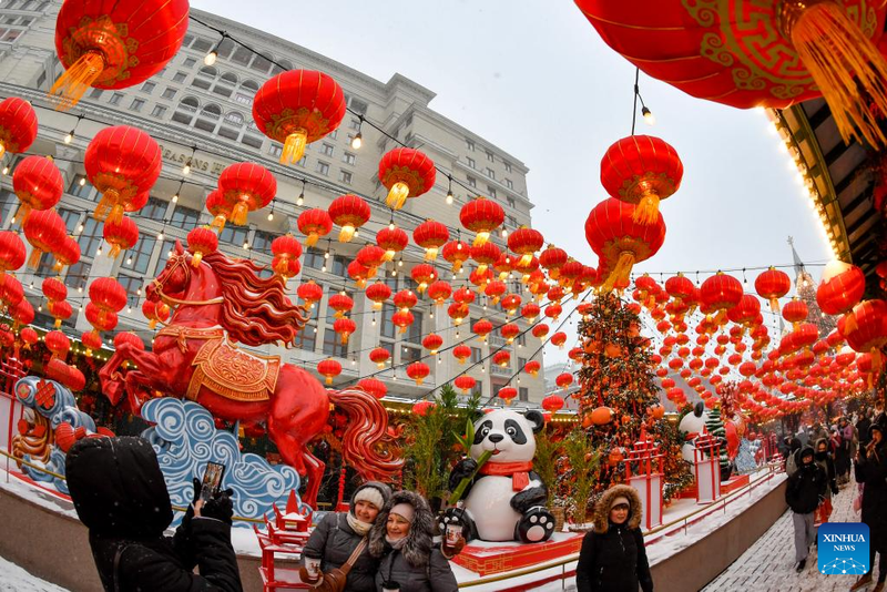 Du khách ngắm nhìn đồ trang trí mừng Tết Nguyên đán tại Moscow, Nga.