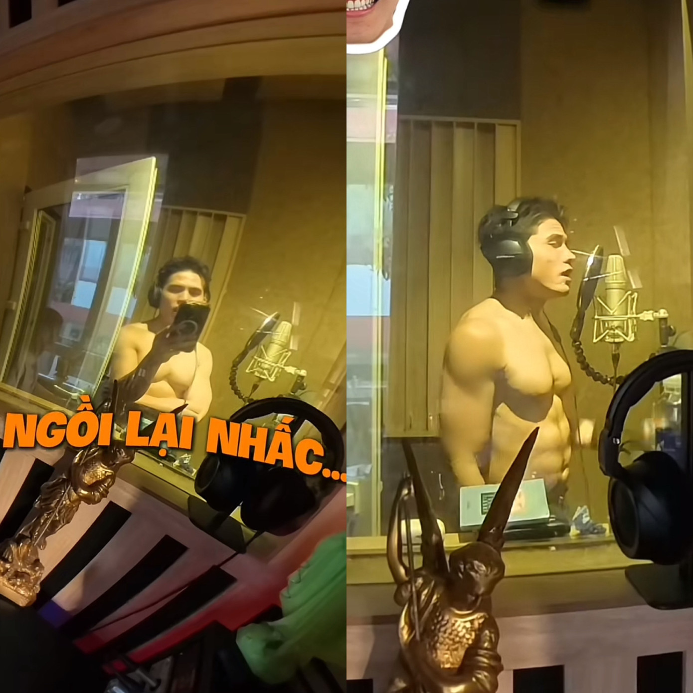 Quốc Thiên vừa thu âm vừa khoe thân hình săn chắc. Nguồn: @leminhhieumusic