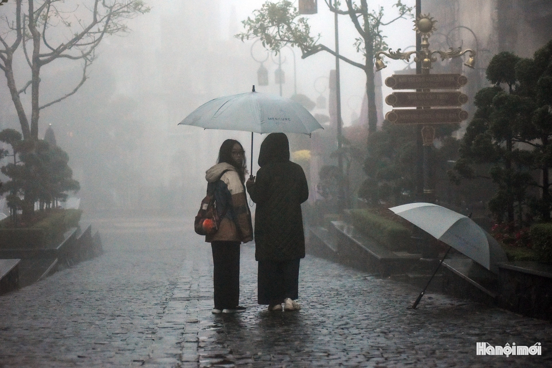 Hai du khách đi trên con đường lát đá ướt khi chiều tối buông xuống tại Bà Nà Hills, mở đầu cho một hành trình trong màn sương.