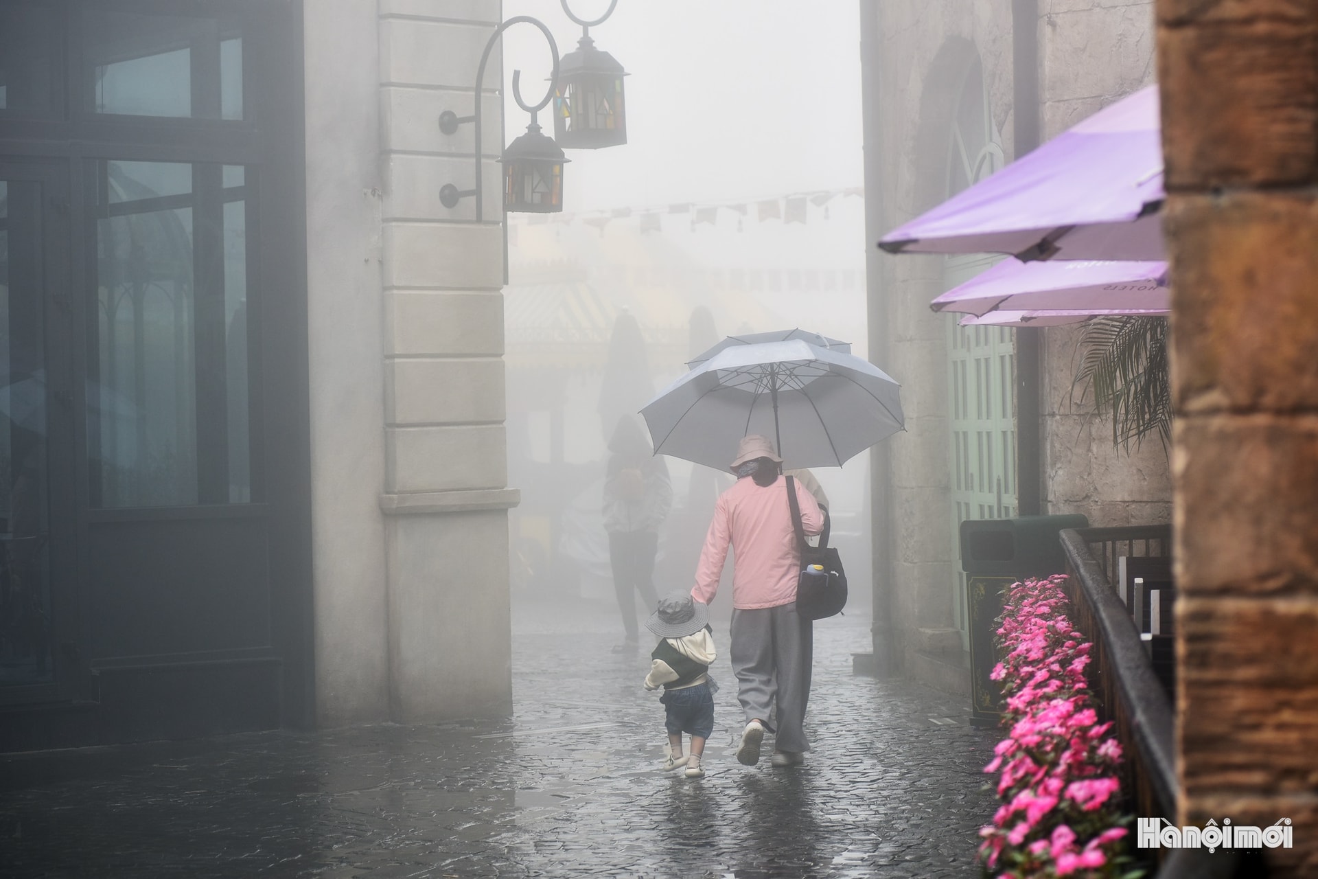 Một con phố đậm kiến trúc Pháp chìm trong sương mù, hiếm thấy cảnh vắng lặng tại điểm du lịch vốn luôn đông đúc.