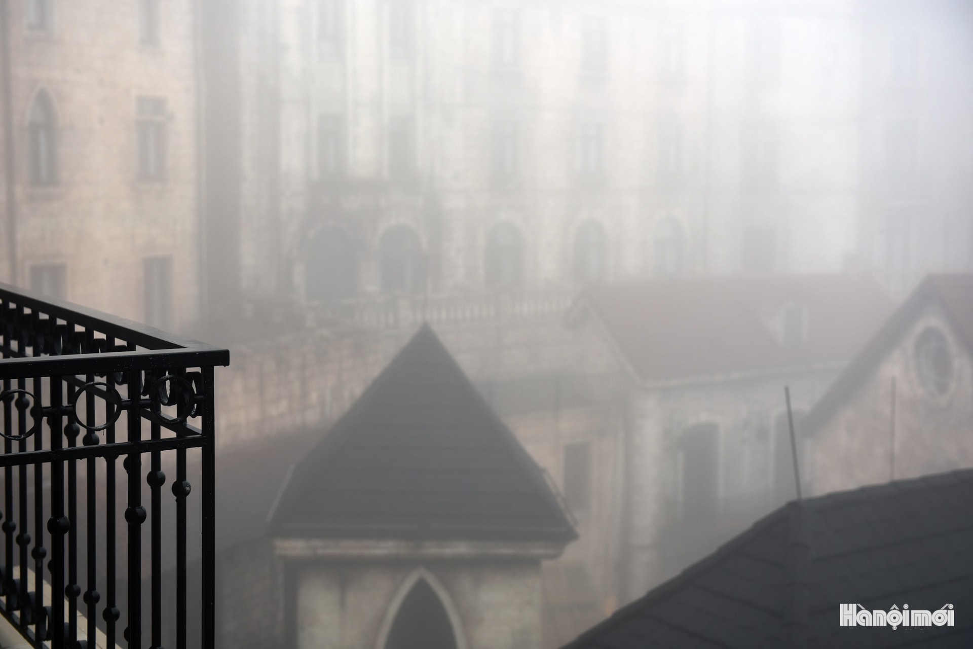 Từ ban công sắt kiểu Pháp nhìn xuống, những mái nhà chìm trong biển sương bao phủ đỉnh núi.