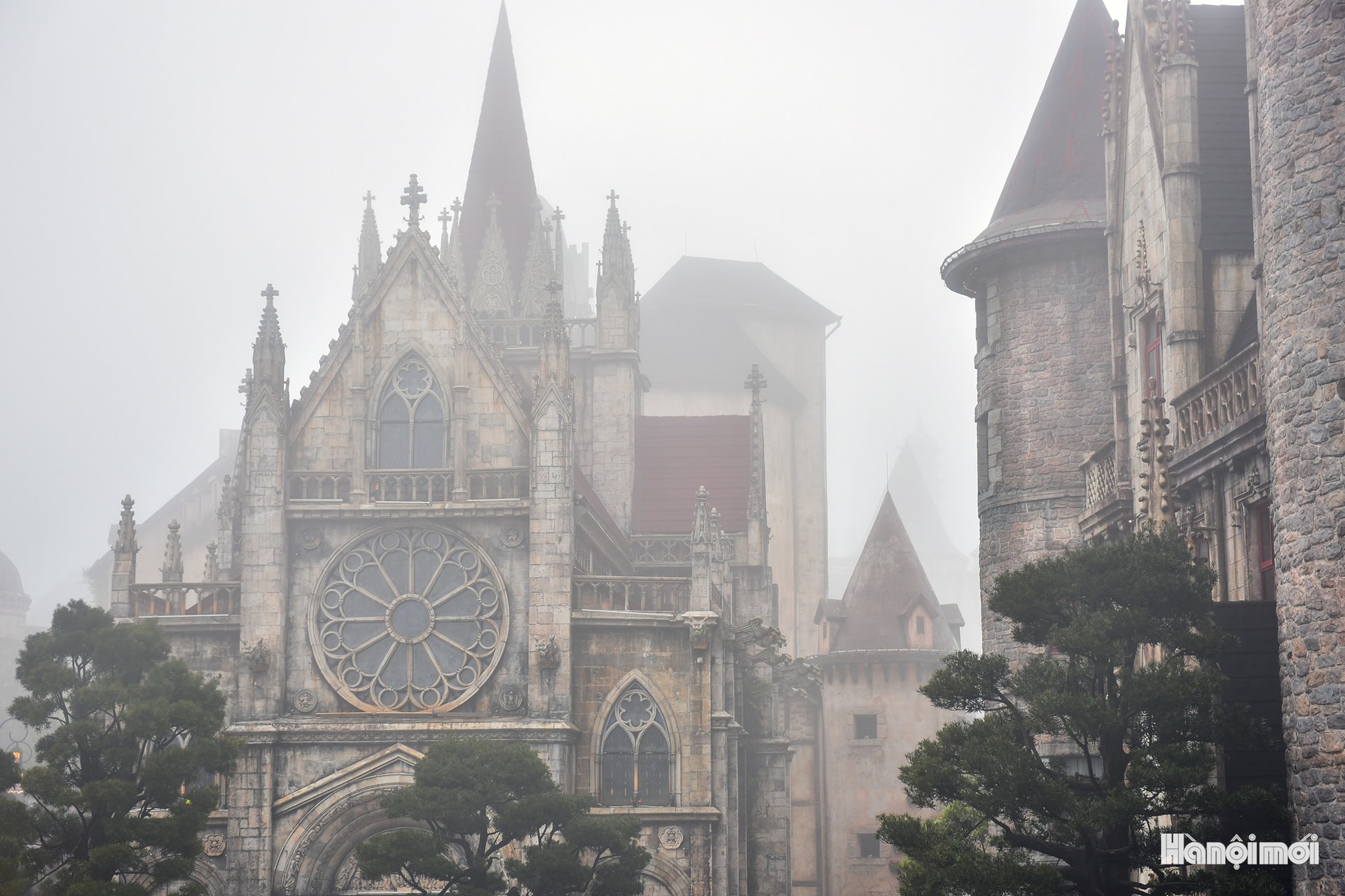 Tháp mái nhọn ẩn hiện sau những cành cây và lớp sương, khiến khu làng Pháp mang dáng dấp của một thị trấn cổ châu Âu.