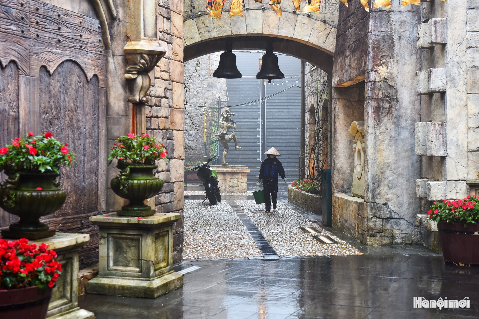 Ngõ nhỏ với cổng vòm treo chuông gợi cảm giác của một thị trấn châu Âu cổ kính giữa mùa đông.
