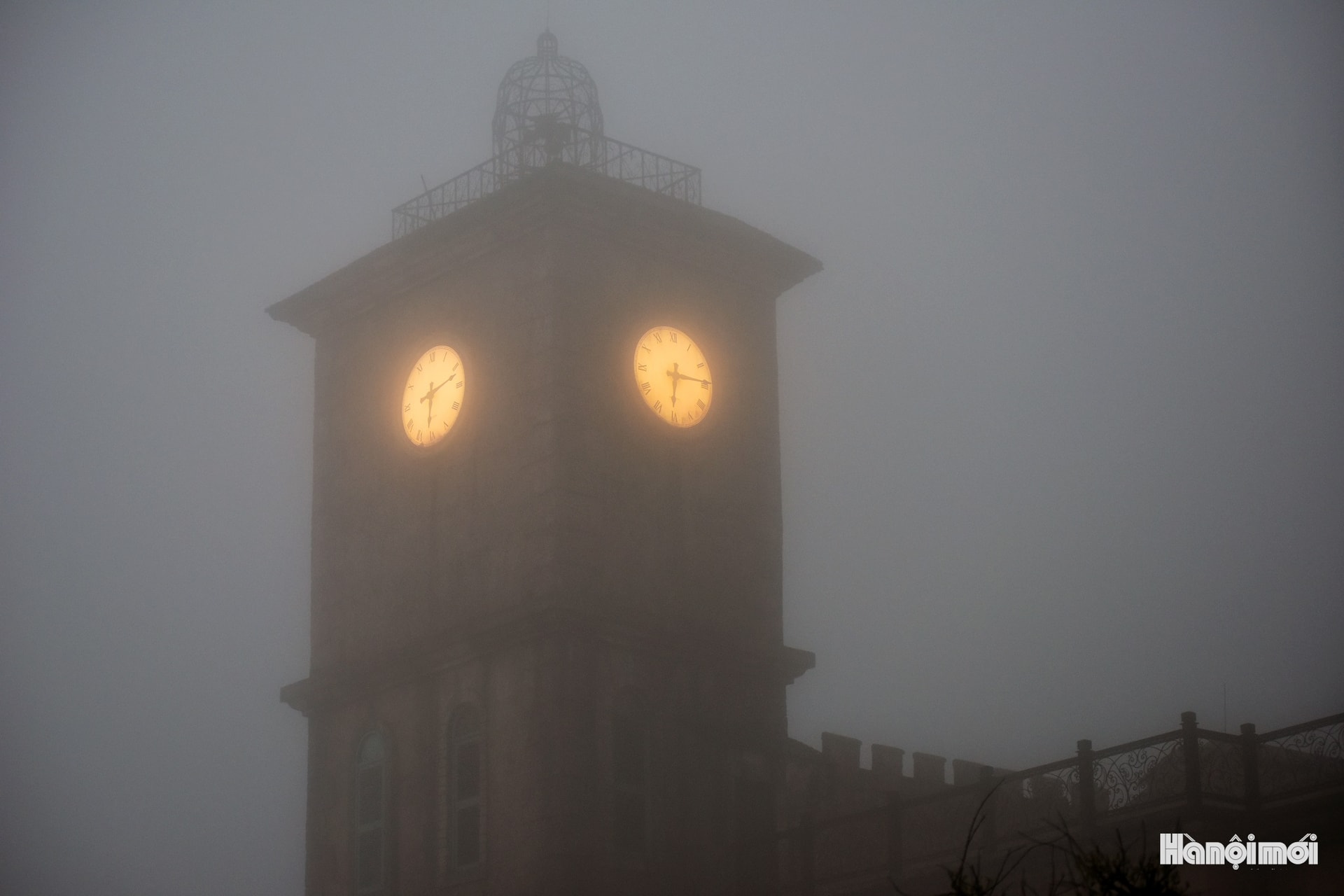 Tháp đồng hồ sáng đèn vàng lúc 18h15, thời điểm thị trấn trên mây chuyển sang nhịp sống chậm và yên tĩnh hơn.