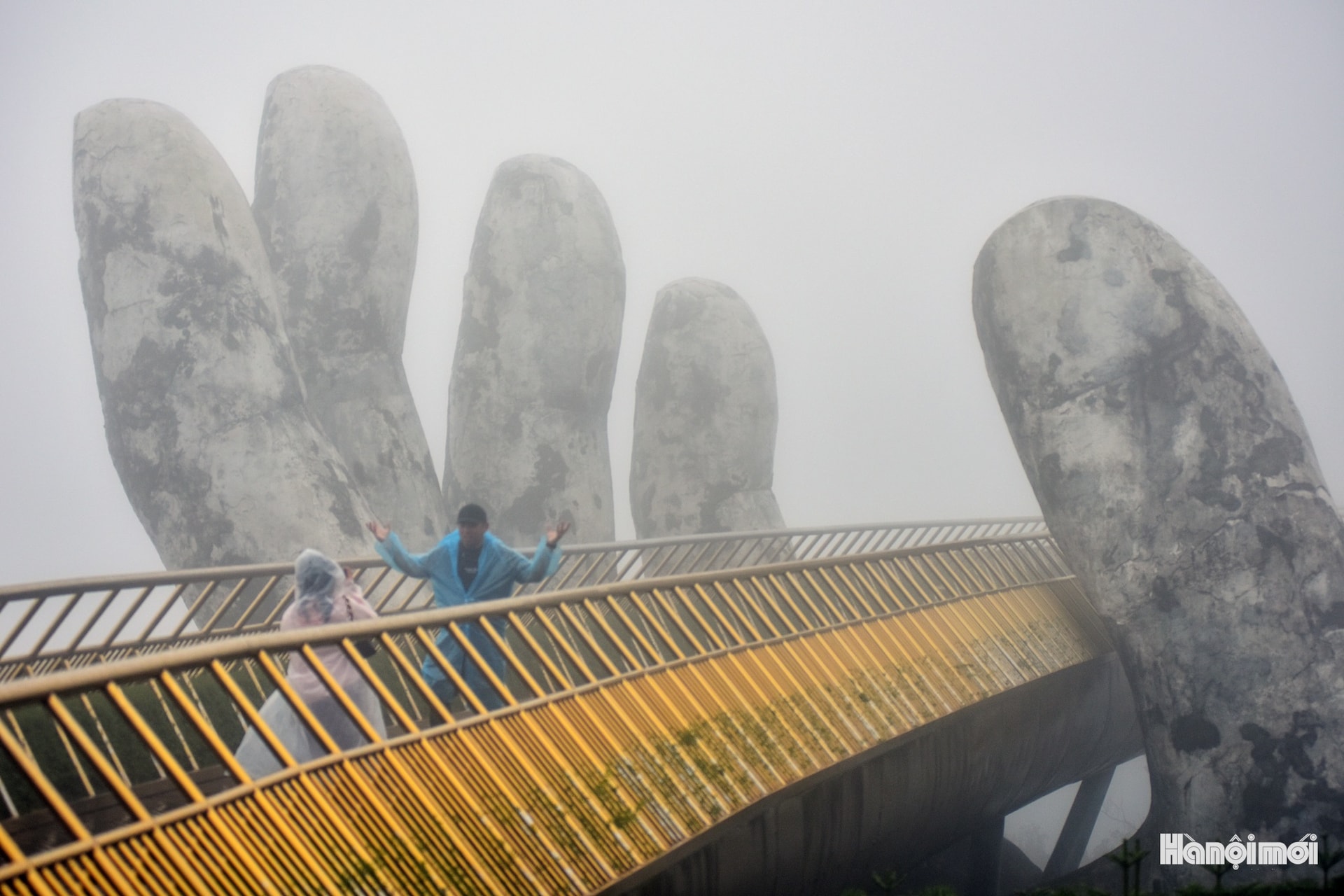 Cầu Vàng hiện lên mờ ảo trong làn sương dày, mang vẻ đẹp khác hẳn những ngày nắng.
