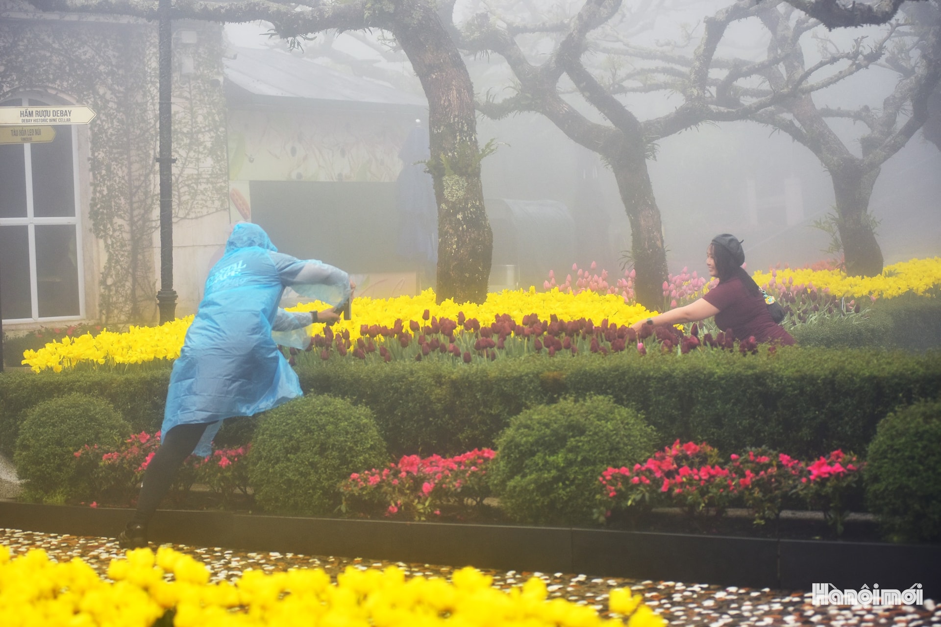 Một du khách kiên nhẫn tạo dáng bên vườn hoa tulip rực rỡ - điểm nhấn màu sắc hiếm hoi giữa không gian lạnh ẩm.