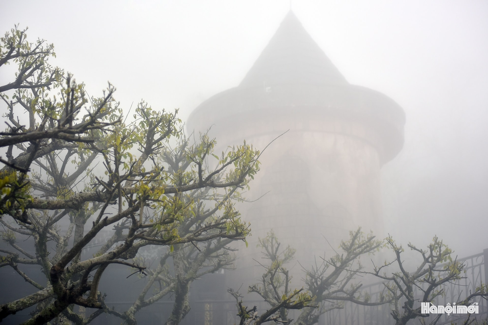 Tháp nhà thờ được chụp từ góc thấp hướng lên, nổi bật giữa màn sương dày đặc của buổi chiều tối trên núi.