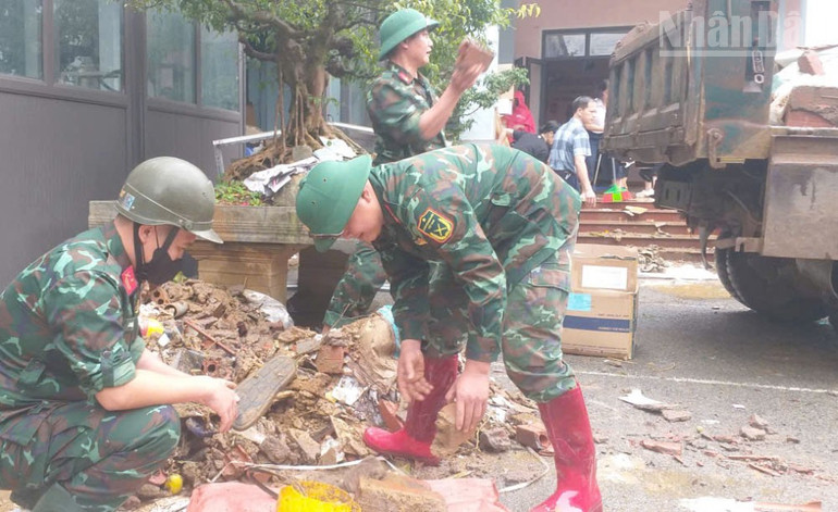 Các lực lượng tham gia hỗ trợ Bệnh viện đa khoa khu vực Vân Hồ, cơ sở Thảo Nguyên dọn dẹp sau khi nước rút. (Ảnh: THỌ SƠN)