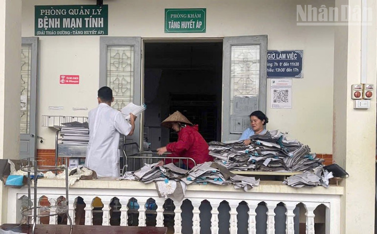 Phòng khám Tăng huyết áp của Bệnh viện đa khoa khu vực Vân Hồ, cơ sở Thảo Nguyên cũng bị ảnh hưởng lớn bởi nước lũ. (Ảnh: THANH VÂN)
