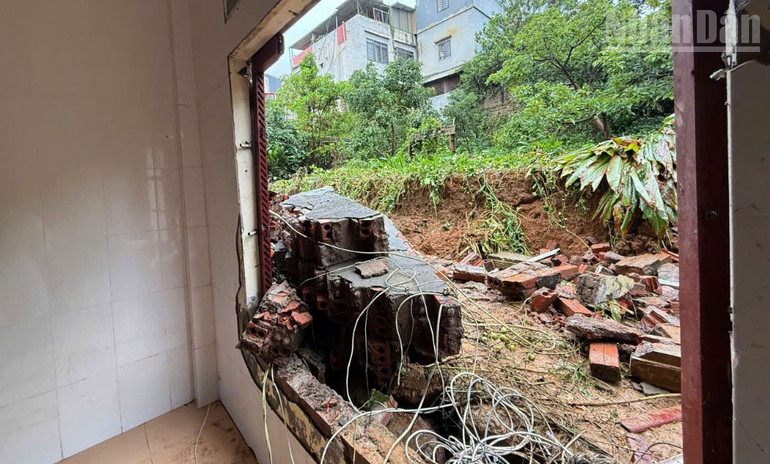 Nguyên nhân được xác định do mưa lớn gây ngập và làm đổ tường của hộ dân sát bệnh viện, khiến nước bất ngờ tràn vào các khoa, phòng, gây ngập úng và đổ cả tường bệnh viện. (Ảnh: THANH VÂN)