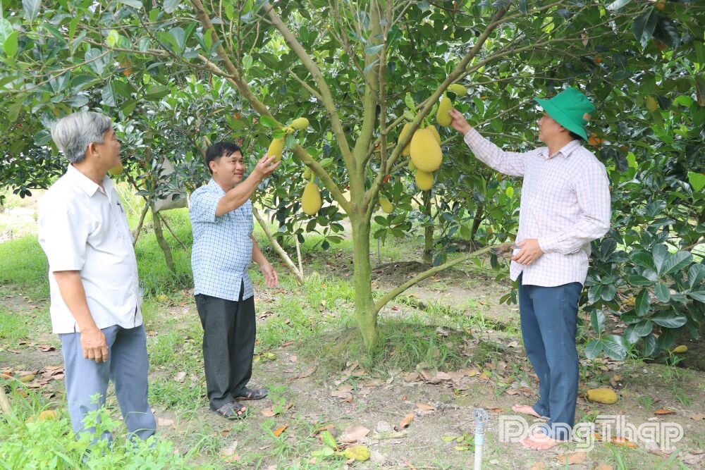Lãnh đạo Chi bộ ấp 2, xã Đốc Binh Kiều đến thăm và tìm hiểu mô hình trồng mít của nông dân trên địa bàn ấp. Ảnh: MỸ XUYÊN