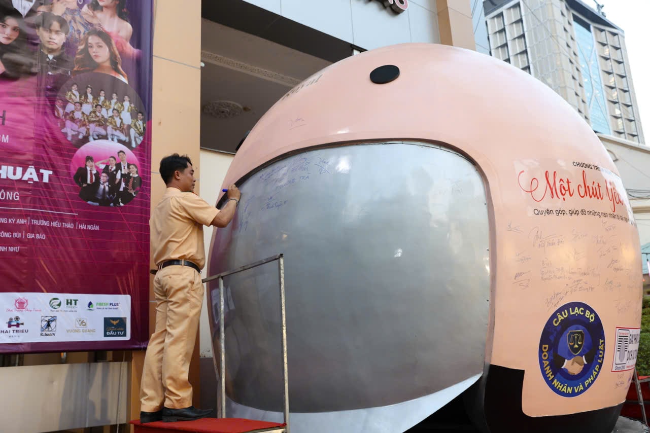 Lực lượng Cảnh sát giao thông ký tên lên mô hình mũ bảo hiểm đặt trước khu vực diễn ra chương trình, như một thông điệp kêu gọi nâng cao ý thức an toàn giao thông