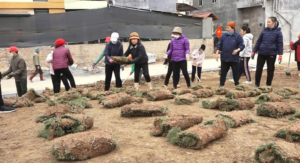 Người dân tổ dân phố Hợp Giang 8, phường Thục Phán hỗ trợ vận chuyển, trải thảm cỏ Sân vận động.