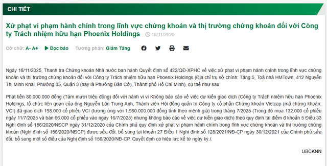 Theo đó, Phoenix Holdings bị phạt 80 triệu đồng đối với hànhvi không báo cáo về việc dự kiến giao dịch. Cụ thể, Phoenix Holdings- tổ chứcliên quan của ông Nguyễn Lân Trung Anh, Thành viên HĐQT CTCP Chứng khoánVietcap (MCK: VCI), đã giao dịch 198.000 cổ phiếu VCI trong tháng 7/2025 nhưngkhông báo cáo giao dịch. Trong đó, mua 132.000 cổ phiếu ngày 11/7/2025 và bán66.000 cổ phiếu vào ngày 16/7/2025.