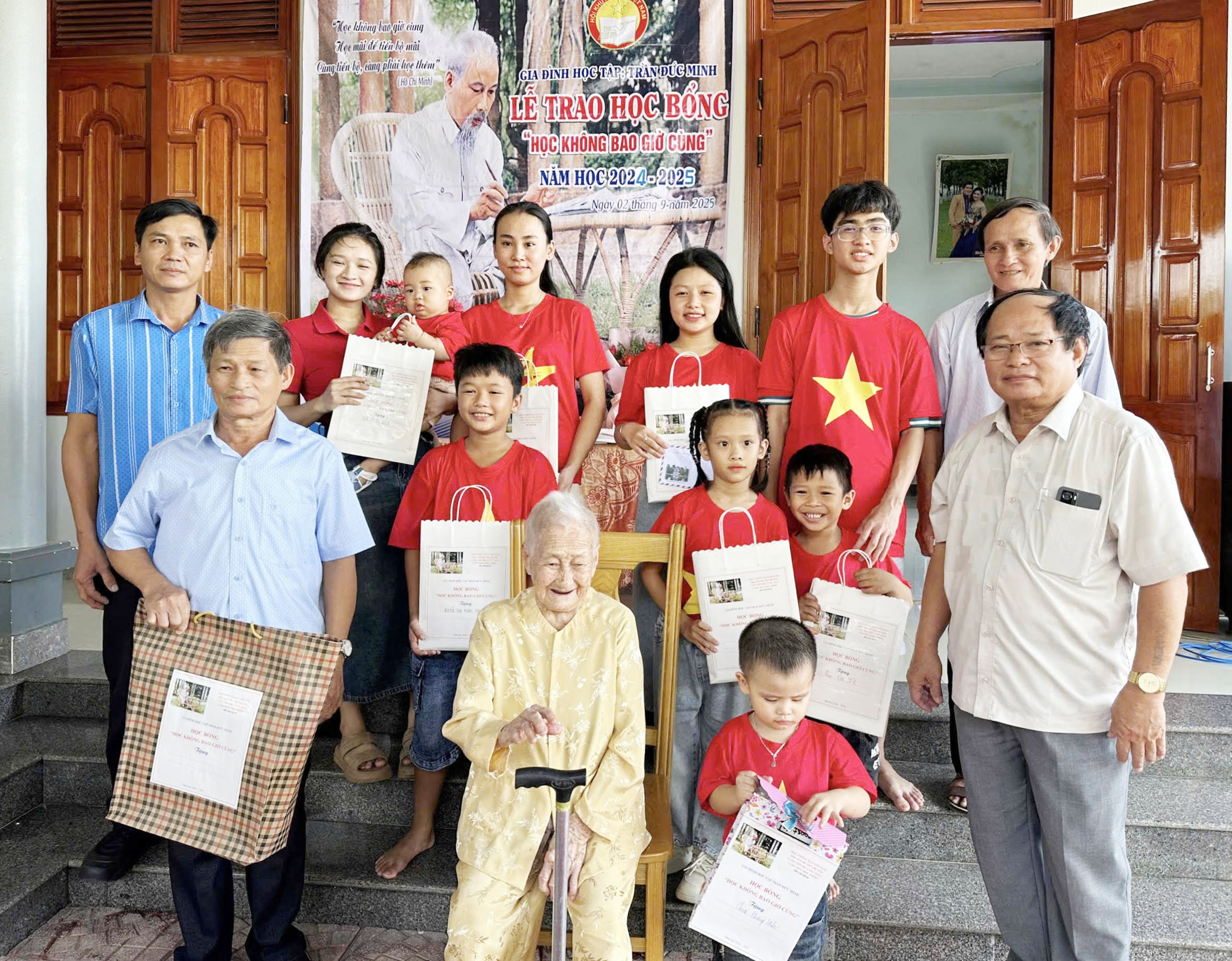 Gia đình bà Võ Thị Đào tổ chức trao học bổng nhằm khích lệ tinh thần học tập cho con cháu. Ảnh: NVCC