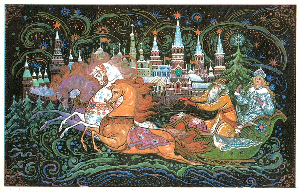 Bưu thiếp Giáng sinh vẽ hình Ông già Tuyết và Công chúa Tuyết trên cỗ xe Troika do họa sĩ Nga vẽ năm 1984. Ảnh: dvaveka.ru