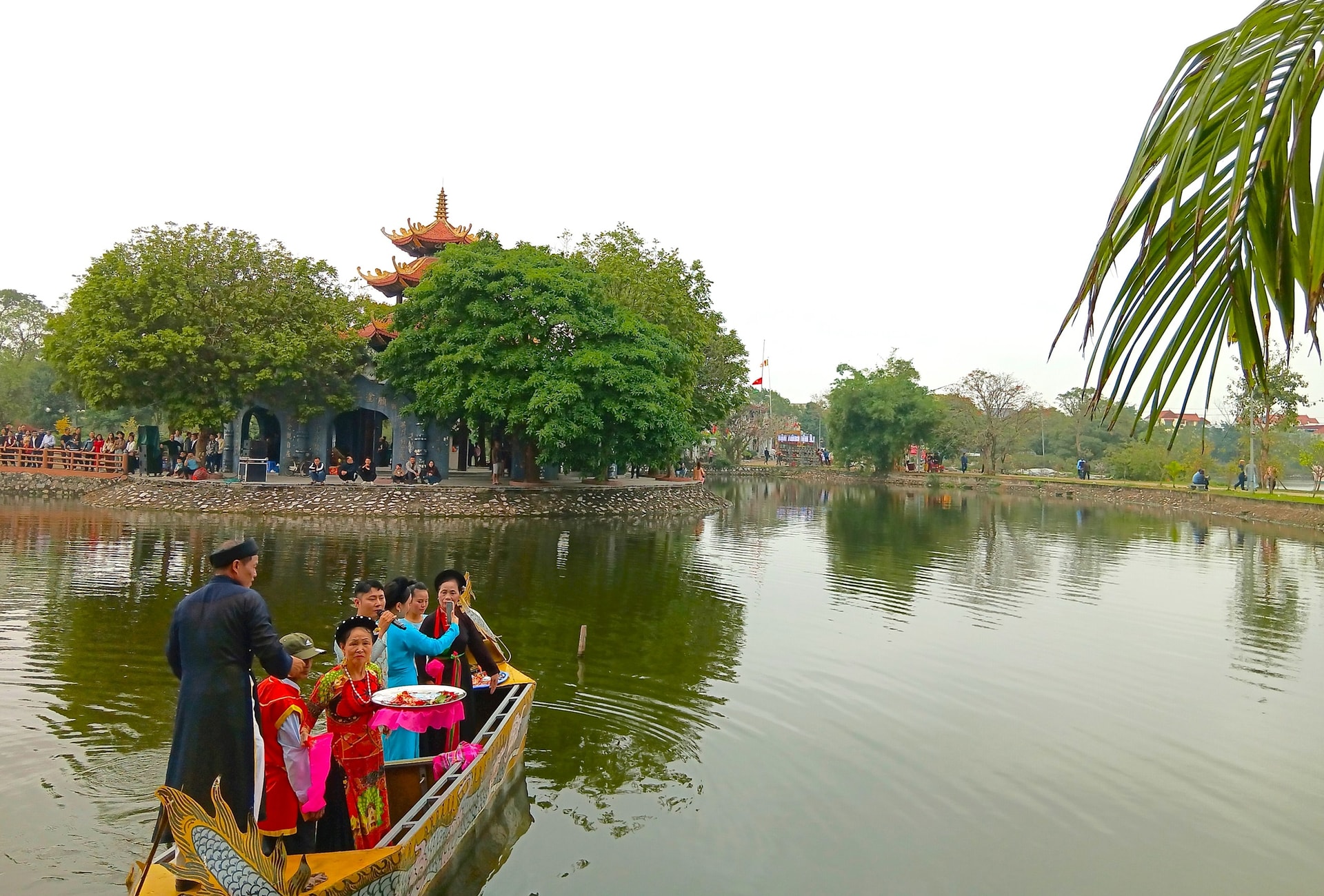 Rời Chùa Đậu, chúng tôi vẫn còn mang theo cảm giác tĩnh lặng rất riêng của không gian cửa Phật. Mặt nước phẳng lặng phản chiếu màu trời nhạt, dọc bờ sông những hàng phong linh vàng rực khẽ lay trong gió, tạo nên một khung cảnh vừa nên thơ vừa an yên. Giữa làn nước trong, chiếc thuyền quan họ chầm chậm trôi nửa dòng sông, tiếng hát giao duyên vang nhẹ khiến không gian như chậm lại, đủ để người ta tạm quên nhịp sống vội vã ngoài kia.