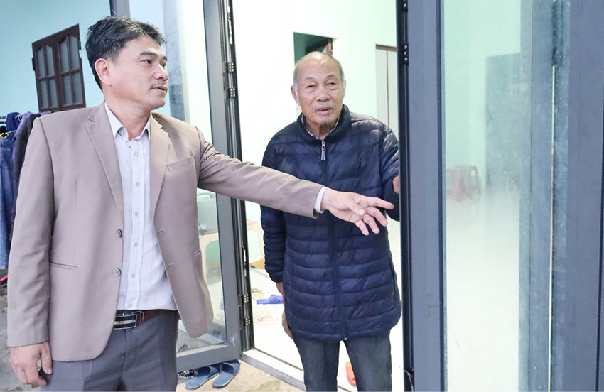 Cán bộ xã Lộc An (trái) thăm gia đình vừa xây mới của hộ anh Huỳnh Tư