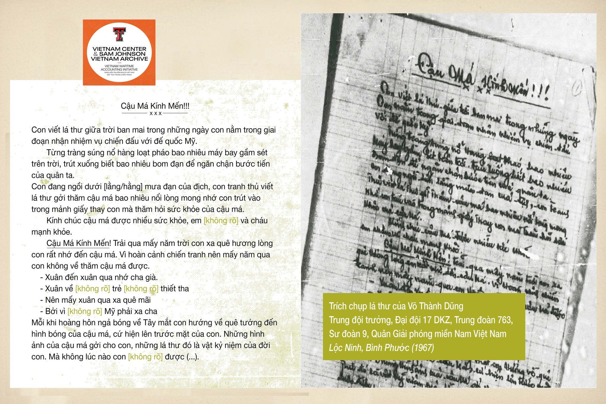 Trong thư, Võ Thành Dũng cho biết đã không nhận được thư từ gia đình từ năm 1966 và tha thiết xin “cậu má” gửi thêm một tấm hình mới, bởi tấm hình cũ đã phai mờ theo thời gian. Nhưng đáng tiếc, chính lá thư này cũng không bao giờ đến được tay người thân.