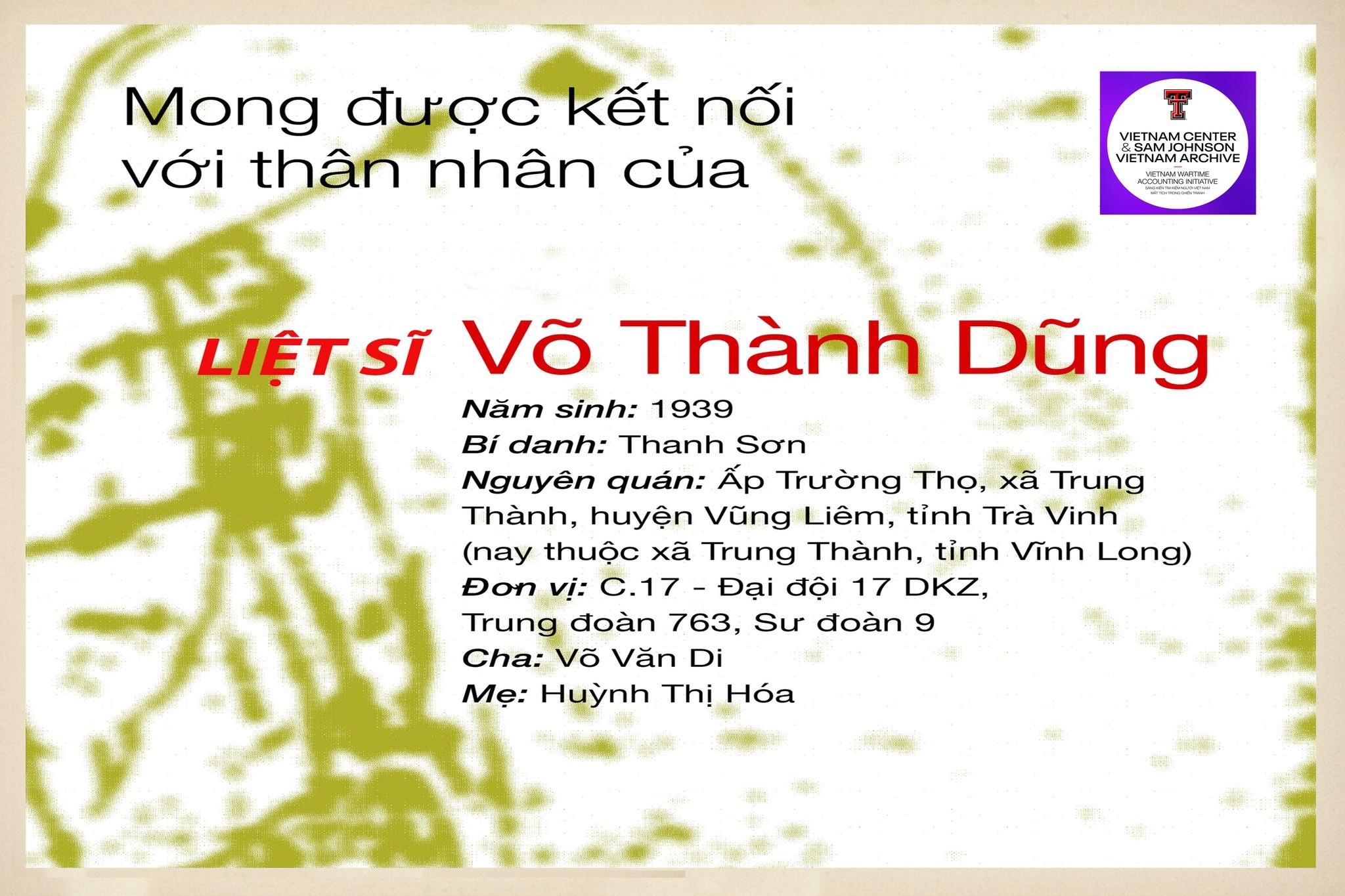 Thông tin về liệt sĩ Võ Thành Dũng (tức Thanh Sơn): sinh 1939. Cha là Võ Văn Di. Mẹ: Huỳnh Thị Hóa. Nguyên quán: Ấp Trường Thọ, xã Trung Thành, huyện Vũng Liêm, tỉnh Trà Vinh cũ. Từng ở đơn vị: C17 – Đại đội 17 DKZ, Trung đoàn 763/273, Sư đoàn 9.