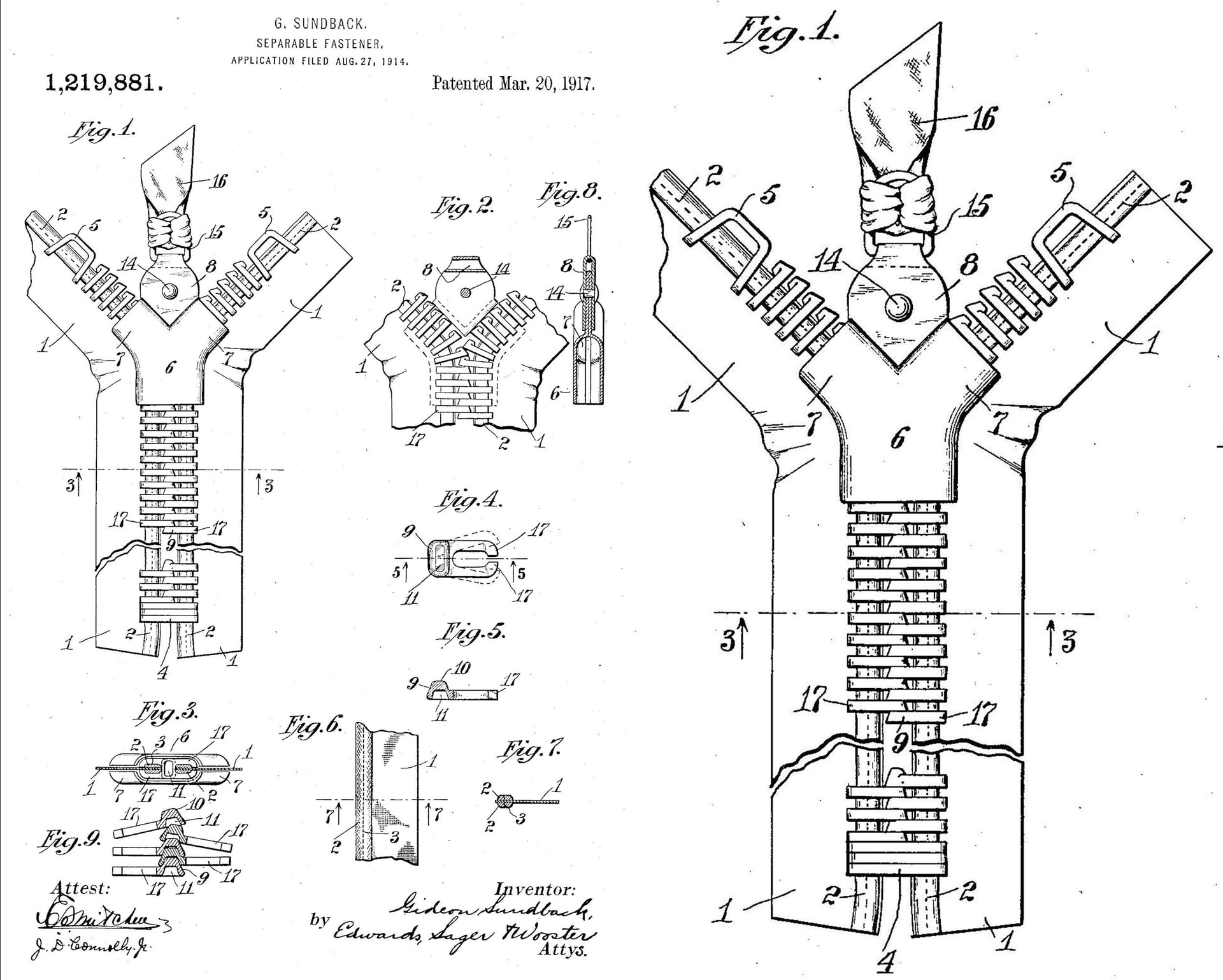 Bản vẽ gốc trong hồ sơ bằng sáng chế “khóa cài tách rời” của kỹ sư Gideon Sundback, nộp tại Mỹ năm 1914 và được cấp năm 1917. Từ thiết kế này, dây kéo nhanh chóng lan rộng khắp thế giới, trở thành vật dụng gắn bó với đời sống hằng ngày - Ảnh: T.L