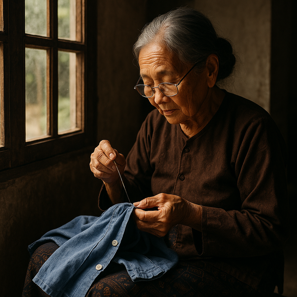 Hình ảnh người mẹ Việt Nam ngồi khâu áo cho con – biểu tượng của sự tảo tần, khéo léo và tình yêu thương lặng lẽ nối liền bao thế hệ - Ảnh: Prompt AI: Tiểu Vũ