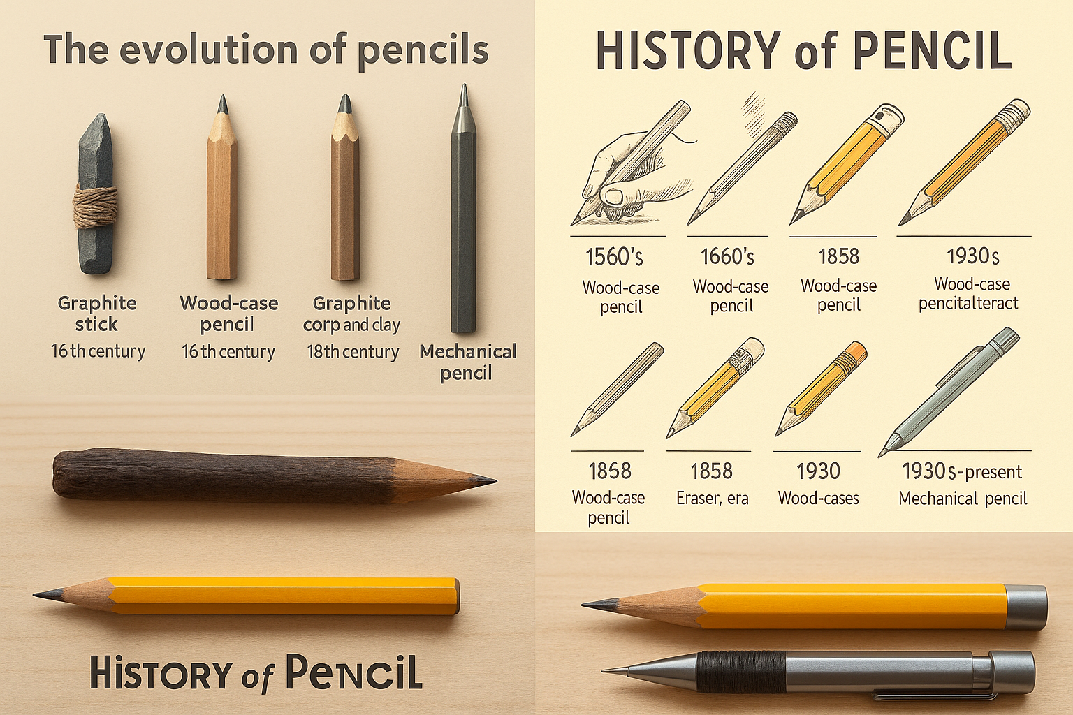 Hành trình phát triển của bút chì qua hơn bốn thế kỷ: từ khối than chì thô khai thác tại Borrowdale (Anh) thế kỷ 16, đến bút chì gỗ cổ điển, và cuối cùng là bút chì hiện đại với thiết kế tinh gọn, giữ nguyên tinh thần giản dị mà bền bỉ - Ảnh: Đồ họa