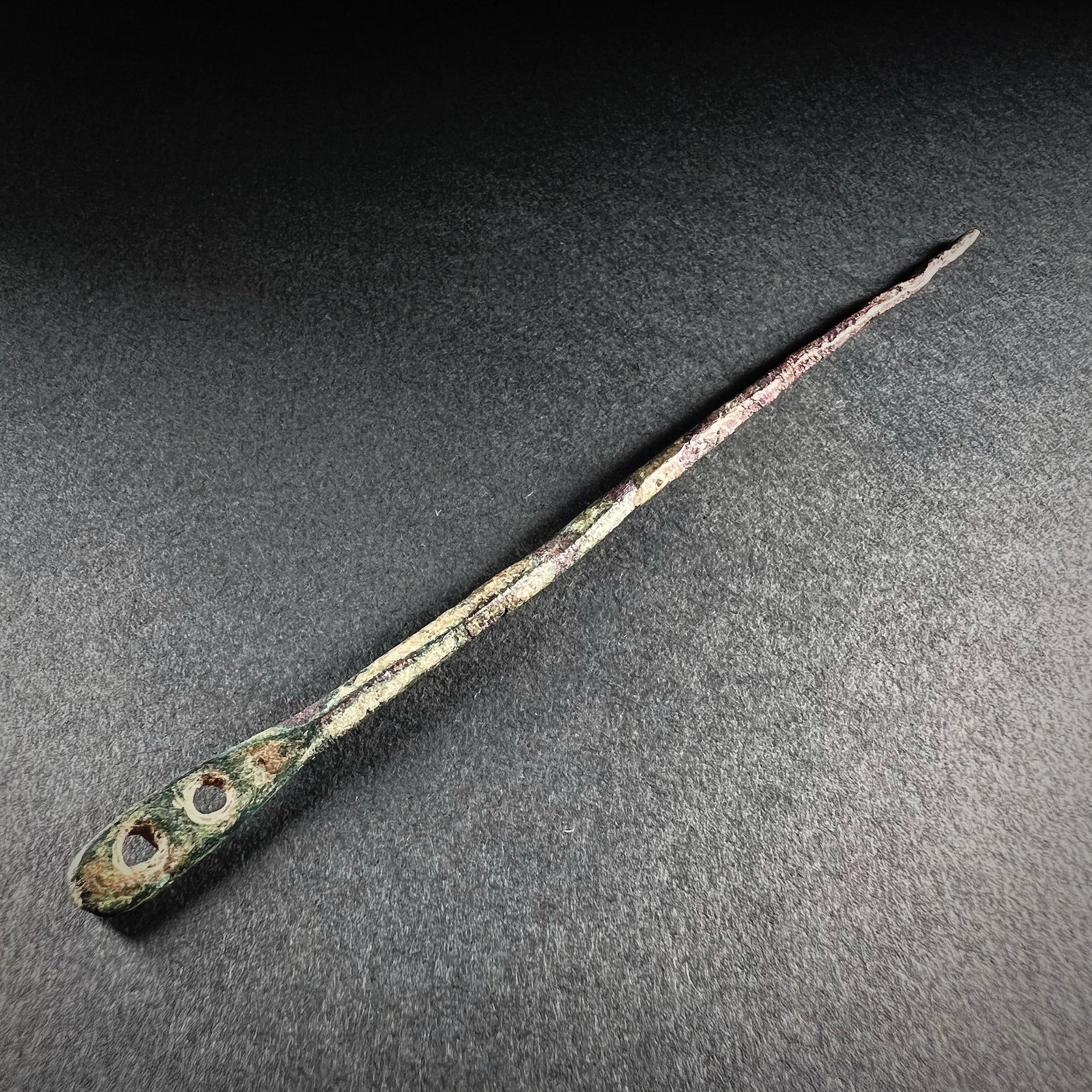 Cây kim may tay bằng đồng có niên đại thời đại đồ đồng, được tìm thấy trong khai quật khảo cổ học - Ảnh: T.L