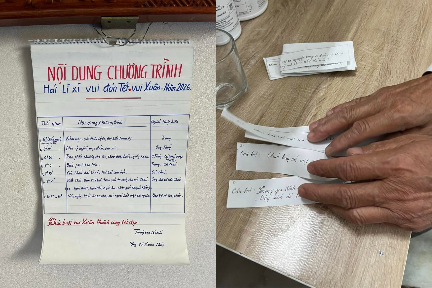 Ông của bạn đã kỳ công chuẩn bị một kịch bản chương trình mang tên "Hái lì xì vui đón Tết - vui Xuân năm 2026, với khung thời gian từ 18h - 22h Mùng Ba. Các "nghi thức" được "gạch đầu dòng" chuyên nghiệp, bao gồm phần phát biểu khai mạc, bắn pháo hoa tiền, hái lì xì - trả lời câu hỏi, trao thưởng, văn nghệ.