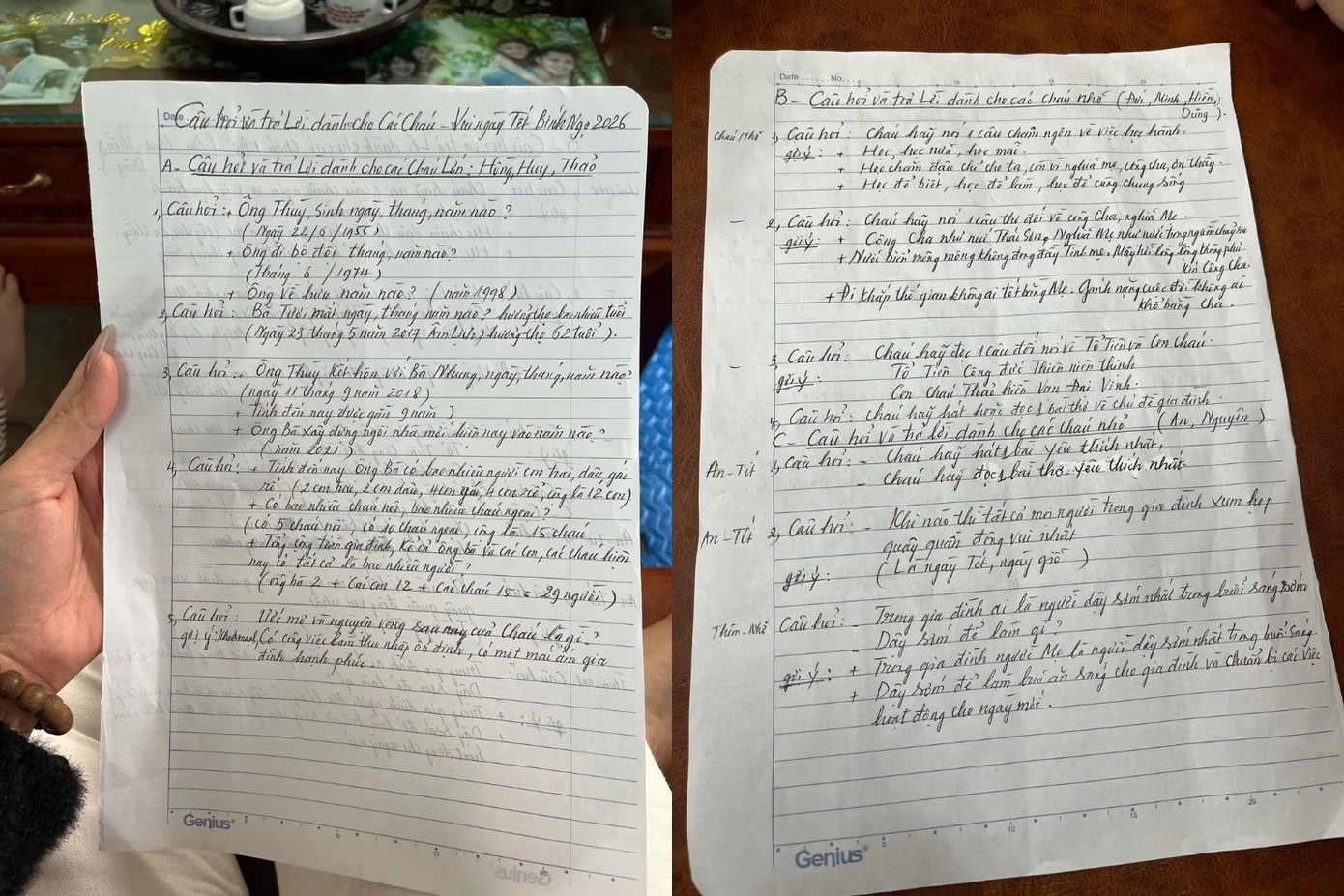 Các hình ảnh được bạn đăng tải còn gây chú ý khi tất cả nội dung đều được ông cẩn thận viết bằng tay, sạch đẹp, rõ ràng. Với những câu đố vui có thưởng, ông tinh tế chia theo cấp độ từ dễ đến khó, phù hợp với độ tuổi của từng thành viên như: Cháu hãy nói một câu châm ngôn về học hành, cháu hãy nói một câu thơ đối về công cha nghĩa mẹ/ tổ tiên và con cháu, cháu hãy hát một bài yêu thích nhất,...