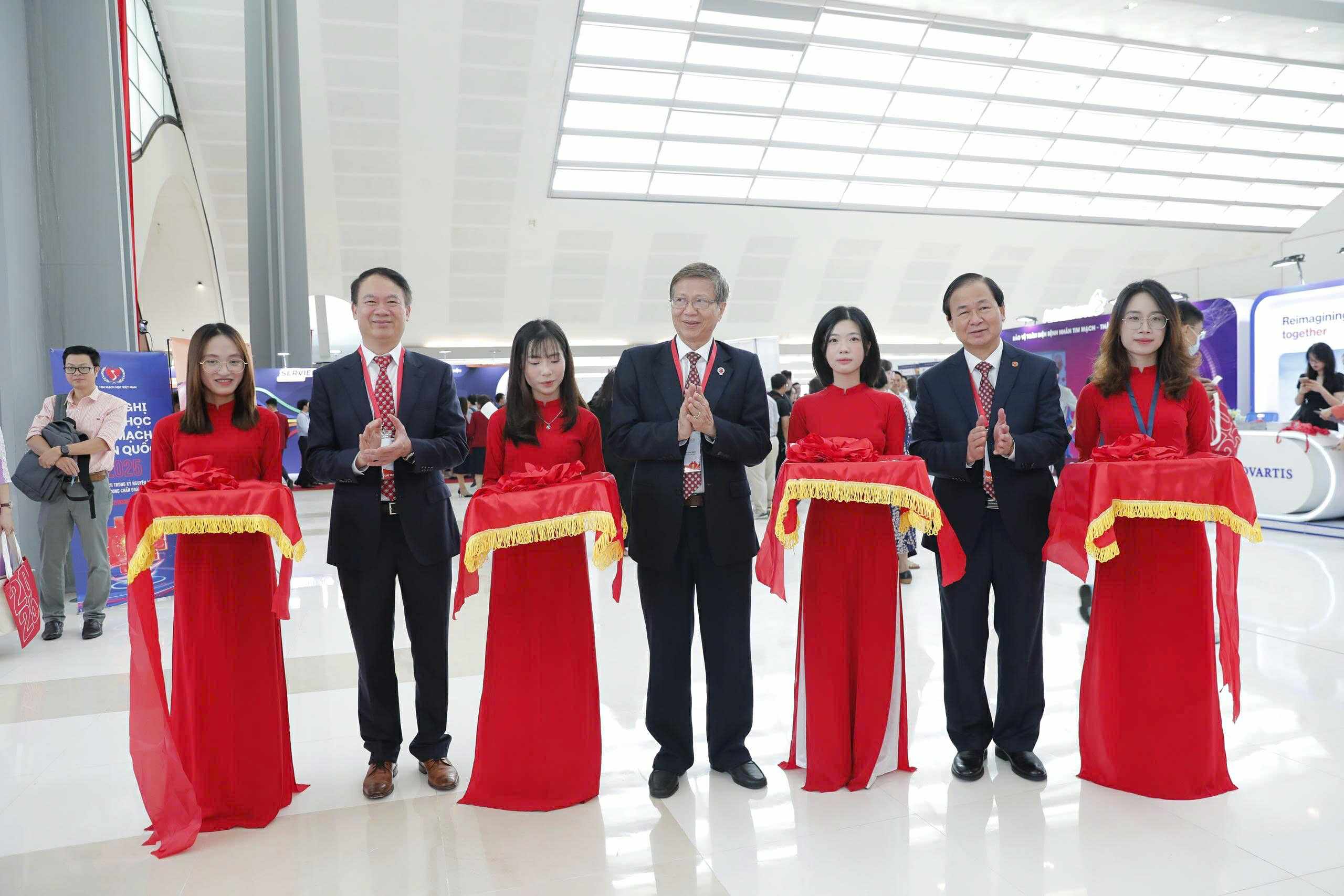 GS.TS Nguyễn Lân Việt, Chủ tịch Hội Tim mạch học Việt Nam cùng các chuyên gia thực hiện nghi thức cắt băng, khai trương Khu vực triển lãm trong khuôn khổ hội nghị.