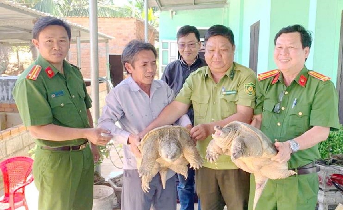 Giao nộp 2 cá thể rùa quý hiếm cho lực lượng chức năng. Ảnh: CALĐ
