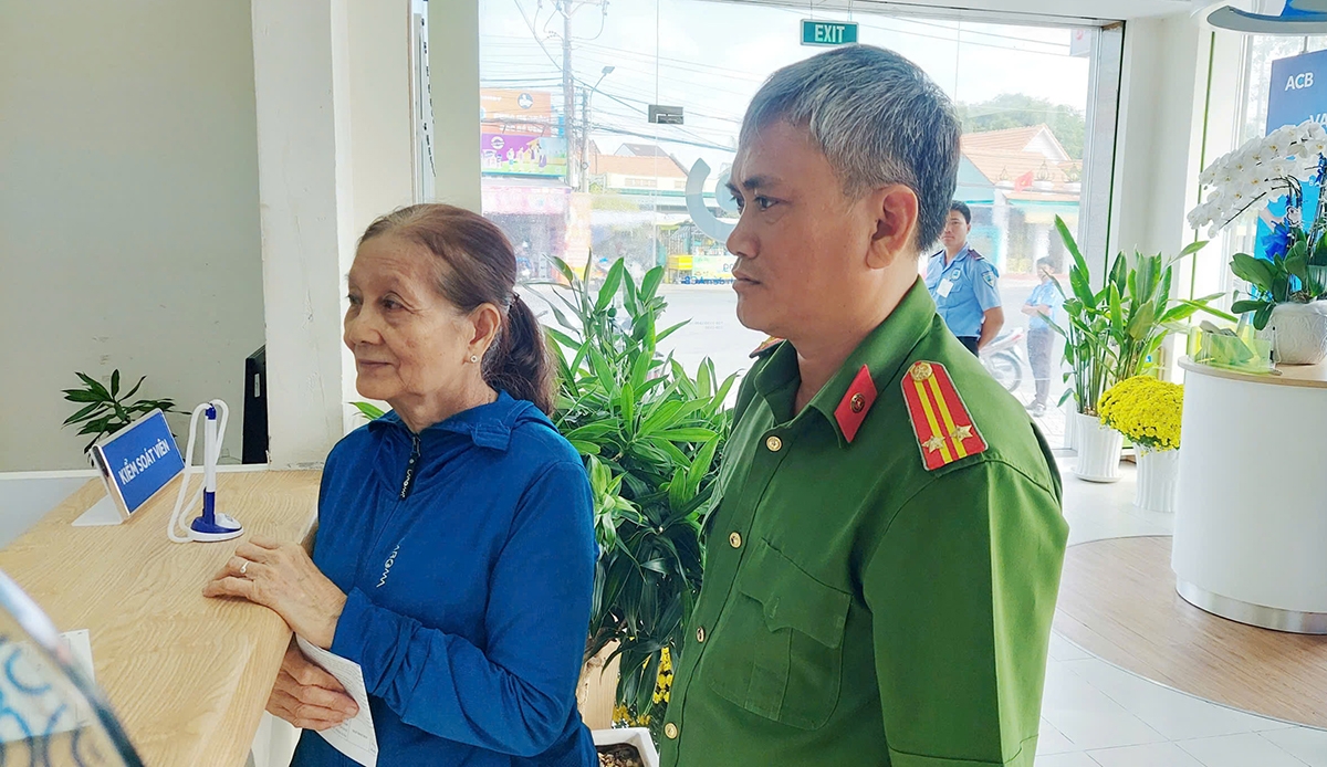 Cán bộ công an xã Ba Tri hỗ trợ bà Nguyễn Thị Minh Châu thực hiện thủ tục chuyển trả lại tiền tại ngân hàng.