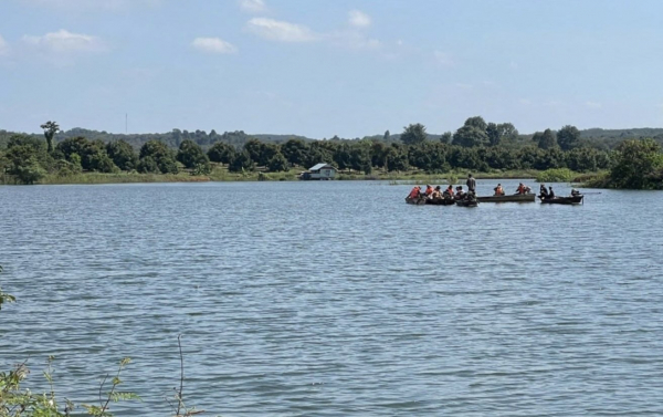 Lực lượng chức năng đang tìm kiếm nạn nhân vụ chìm thuyền ở hồ thủy điện Thác Mơ.