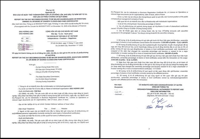 Ở chiều ngược lại, trước đó, một cổ đông khác của ChươngDương Corp là bà Đỗ Ngọc Mai đã bán ra 100.800 cổ phiếu CDC trong phiên giao dịchngày 5/11/2025.