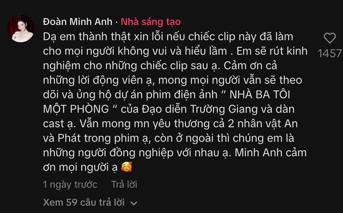 Trước những phản ứng này, Đoàn Minh Anh đã nhanh chóng lên tiếng đính chính và gửi lời xin lỗi công khai. Trên trang cá nhân, nữ diễn viên chia sẻ: “Dạ em thành thật xin lỗi nếu chiếc clip này đã làm cho mọi người không vui và hiểu lầm. Em sẽ rút kinh nghiệm cho những chiếc clip sau ạ. Cảm ơn cả những lời động viên ạ, mong mọi người vẫn sẽ theo dõi và ủng hộ dự án phim điện ảnh Nhà Ba Tôi Một Phòng của đạo diễn Trường Giang và dàn cast ạ. Vẫn mong mọi người yêu thương cả 2 nhân vật An và Phát trong phim ạ, còn ở ngoài thì chúng em là những người đồng nghiệp với nhau ạ. Minh Anh cảm ơn mọi người ạ”.