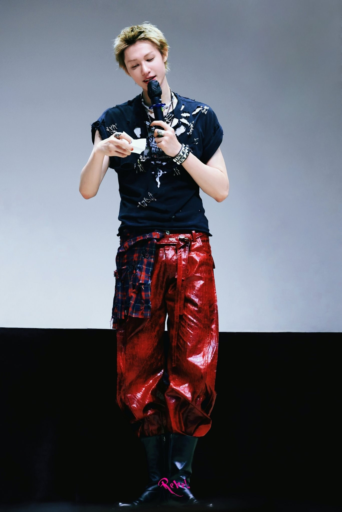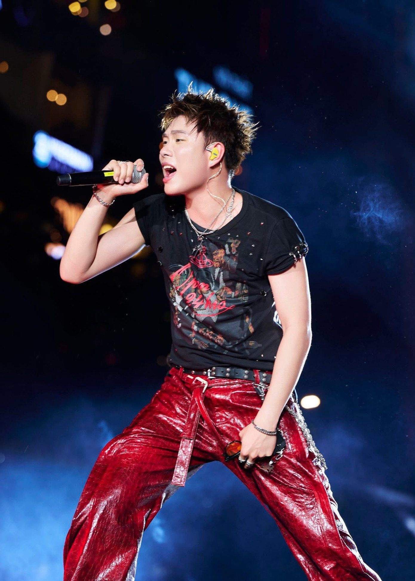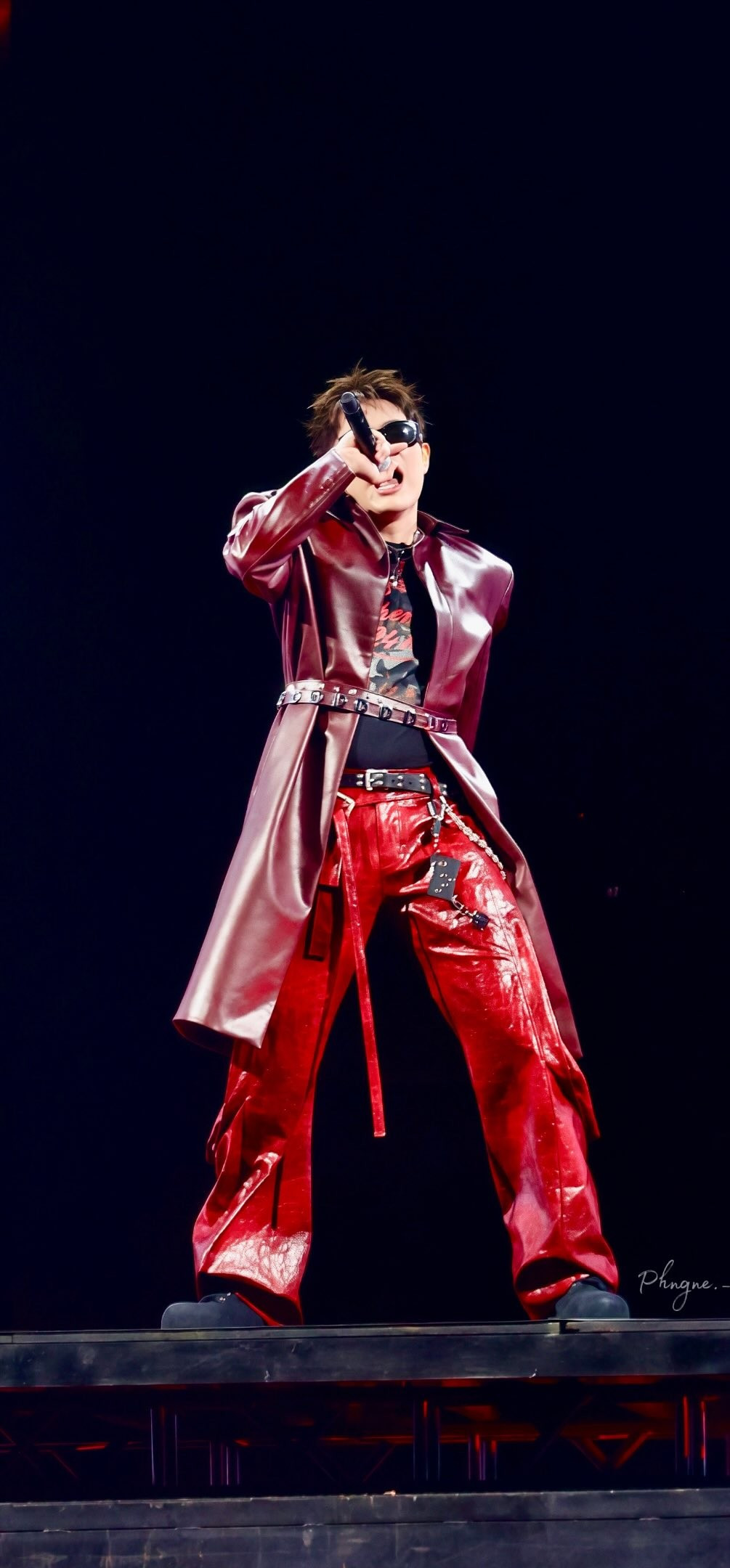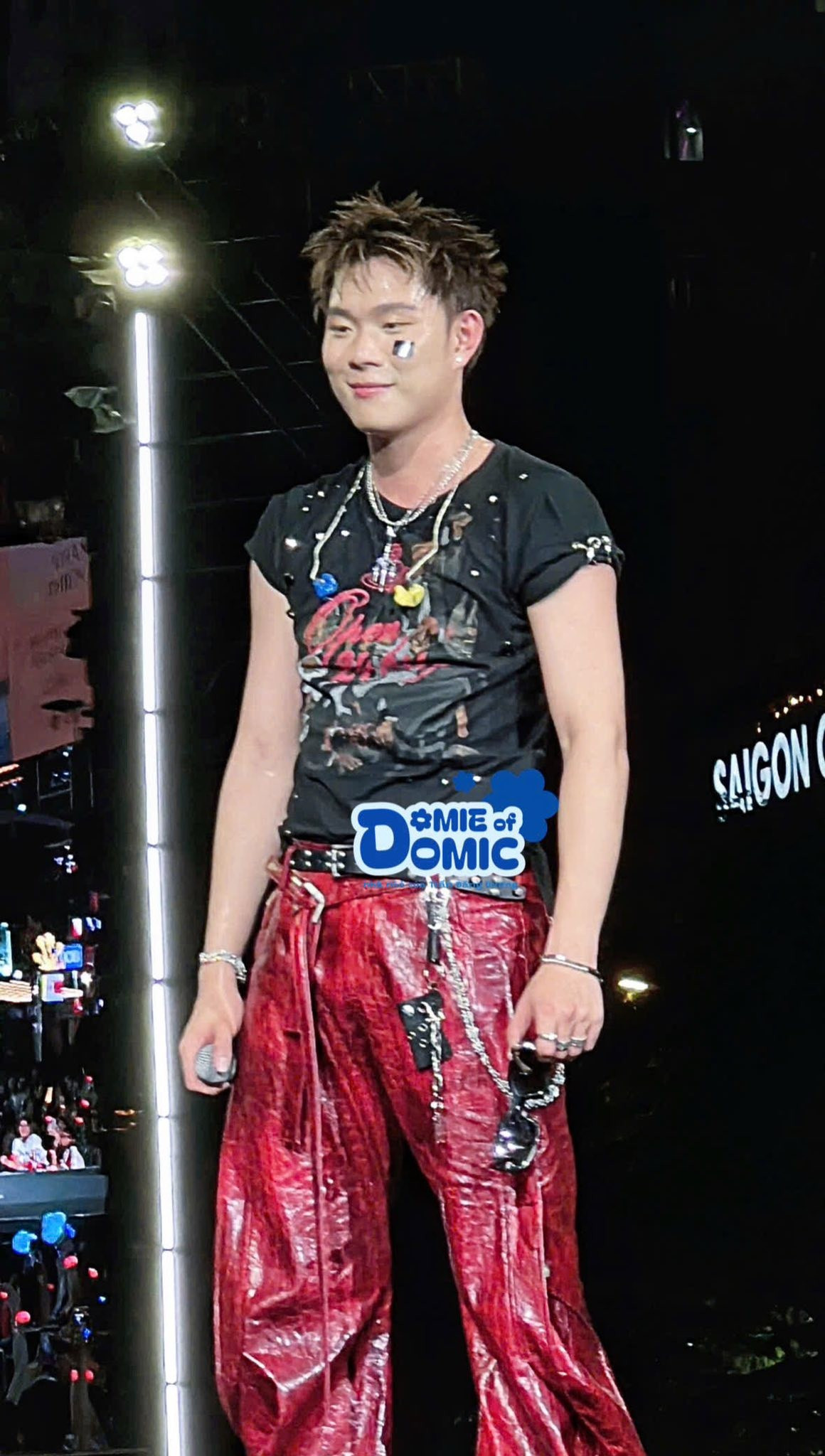Hơn nữa, bộ cánh đầy đủ khi lên sân khấu của Dương Domic còn có áo khoác da đỏ đô dáng dài - chi tiết khác biệt so với của Martin. Gam đỏ-đen cũng là dress code của sự kiện, không phải lựa chọn riêng của stylist.