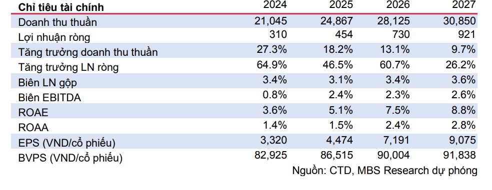 MBS ước tính biên lợi nhuận gộp sẽ cải thiện 0,3/0,2 điểm % nhờ nguồn việc thuận lợi trong bối cảnh đẩy mạnh nguồn cung bất động sản và các biện pháp thành lập chuỗi cung ứng nguyên vật liệu giảm thiểu đà tăng của giá đầu vào. Bên cạnh đó, dự án Emerald 68 kỳ vọng có thể ghi nhận lợi nhuận từ liên doanh liên kết (sở hữu 49%) khi đã mở bán trong đầu năm 2025 và đạt tỷ lệ hấp thụ trên 70%. Nhờ biên gộp cải thiện và ghi nhận lợi nhuận từ mảng bất động sản. Lợi nhuận ròng có thể đạt 730 tỷ đồng vào năm 2026 và 921 tỷ trong năm 2027, tương ứng với mức tăng lần lượt 61%/26%.