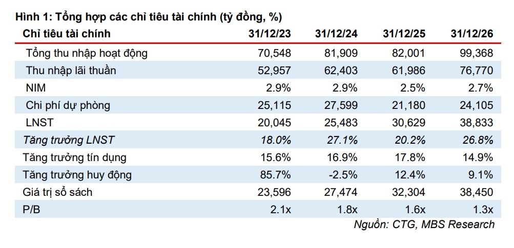 MBS duy trì khuyến nghị khả quan đối với cổ phiếu CTG với giá mục tiêu mới là 65.400 đồng/cổ phiếu. MBS điều chỉnh tăng P/B mục tiêu lên 1.9x lần phản ánh vị thế của CTG xứng đáng có được mức định giá vượt trội so với toàn ngành. P/B mục tiêu này cao hơn 15% so với toàn ngành và các NHTMCP có quy mô lớn.