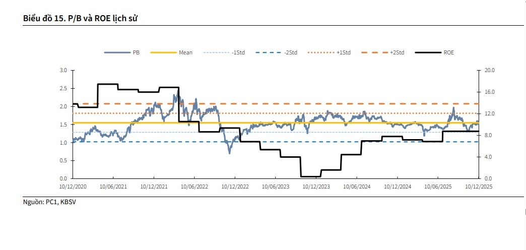 Mảng EPC của PC1 kỳ vọng ghi nhận mức tăng trưởng doanh thu lần lượt 63%/16% so với cùng kỳ năm trước trong 2025/2026 và duy trì backlog tích cực từ nay đến 2030 nhờ: backlog cuối 3Q2025 của PC1 ghi nhận hơn 8.000 tỷ đồng và quy hoạch điện VIII điều chỉnh đảm bảo nguồn công việc cho PC1 cả trong ngắn hạn và dài hạn. Sản lượng thủy điện 2025 tăng trưởng 5% so với cùng kỳ năm trước nhờ tình hình thủy văn tích cực trong cả năm. Tuy nhiên, sang 2026, khi thời tiết chuyển dần sang pha trung tính và tăng dần xác suất El Nino về cuối năm, thủy điện ước đạt 563 triệu kWh (-8,5% so với cùng kỳ năm trước) Dự án bất động sản dân cư Phú Thị Riverside gồm 182 căn biệt thự và liền kề đang bước vào giai đoạn hoàn thiện mặt ngoài và cất nóc, kì vọng đóng góp 102/62 tỷ đồng lợi nhuận 2025/2026 cho PC1.