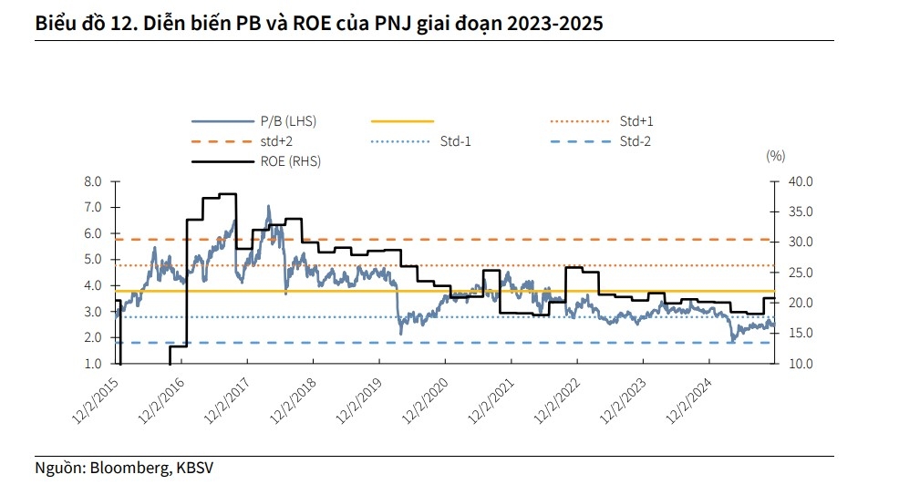 KBSV xác định giá mục tiêu của PNJ đến cuối 2026 là 105.600 đồng/cổ phiếu, tương đương tiềm năng tăng giá là 20%. PNJ đang được giao dịch với mức PE dự phóng 2026 là 12 lần, thấp hơn so với mức trung bình 5 năm của doanh nghiệp, cho thấy triển vọng đầu tư khá hấp dẫn.