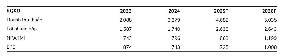 Tổng kết, lợi nhuận ròng đạt 2.840 tỷ đồng, tăng 34%. Lũy kế cả năm 2025, doanh thu và lợi nhuận ròng đạt 63.645/9.410 tỷ đồng, hoàn tất 97%/95% dự báo của MBS Research.