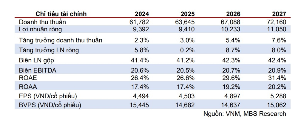 MBS kỳ vọng 750 cửa hàng Vinamilk với nhận diện thương hiệu mới, cùng hệ thống phân phối bán lẻ được ổn định sẽ là động lực tăng trưởng chính cho VNM, giúp cho sản lượng gia tăng. Kết hợp với chiến lược cao cấp hóa sản phẩm, nâng cao chất lượng sản phẩm với hàm lượng dinh dưỡng cao giúp cho tổng doanh thu tăng 5%/7% so với cùng kỳ trong năm 2026-2027. Bên cạnh đó, giá nguyên vật liệu đầu vào giảm nhiệt nhờ nguồn cung dồi dào quốc tế sẽ giúp cho biên lợi nhuận gộp cải thiện 1d% so với cùng kỳ trong 2026 và duy trì trong năm 2027. Tổng kết, MBS ước tính tăng trưởng kép lợi nhuận ròng đạt 8,5% trong năm 2026-2027.