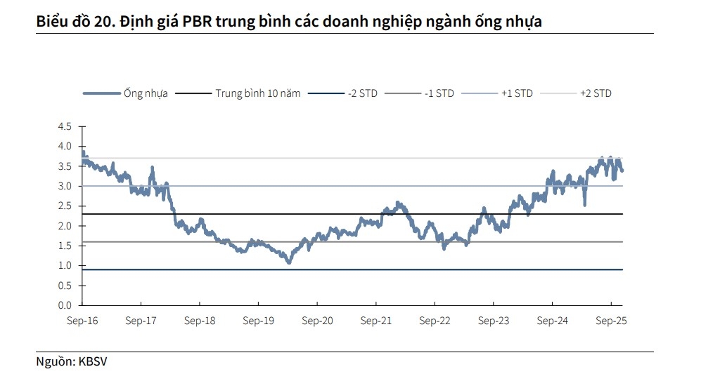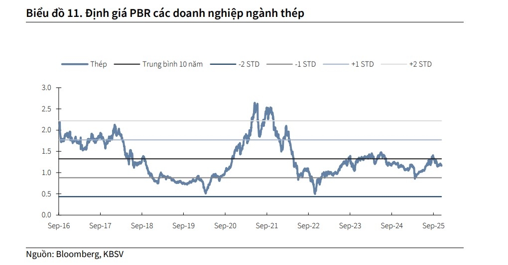 KBSV đánh giá trung lập với ngành Vật liệu xây dựng trong 2026 PBR đang các doanh nghiệp ngành Thép đang ở vùng trung bình 10 năm, trong khi PBR của các nhà sản xuất ống nhựa đang ở vùng +2 STD lịch sử. KBSV kỳ vọng nhu cầu trong nước sẽ tiếp tục là động lực chính thúc đẩy sản lượng tiêu thụ VLXD trong 2026. Nhà đầu tư có thể cân nhắc và lựa chọn những doanh nghiệp có câu chuyện tăng trưởng bền vững tới từ việc mở rộng công suất, gia tăng thị phần và hưởng lợi từ diễn biến giá bán/chi phí đầu vào thuận lợi.