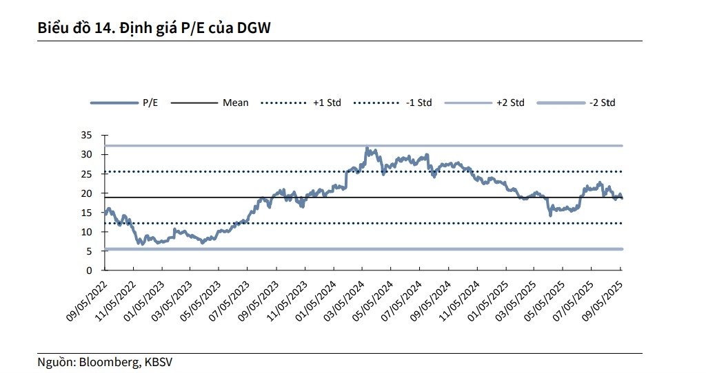 KBSV dự phóng KQKD năm 2025 của DGW với doanh thu thuần đạt 24.694 tỷ đồng (+11,8% so với cùng kỳ năm trước) và lợi nhuận sau thuế (LNST) đạt 545 tỷ đồng (+23,1% so với cùng kỳ năm trước), nhờ tập trung danh mục sản phẩm vào các mặt hàng có tiềm năng tăng trưởng tích cực như thiết bị gia dụng, văn phòng và tiêu dùng. KBSV đưa ra khuyến nghị trung lập đối với cổ phiếu DGW cho năm 2025 với mức giá mục tiêu 46.000 đồng/cổ phiếu.