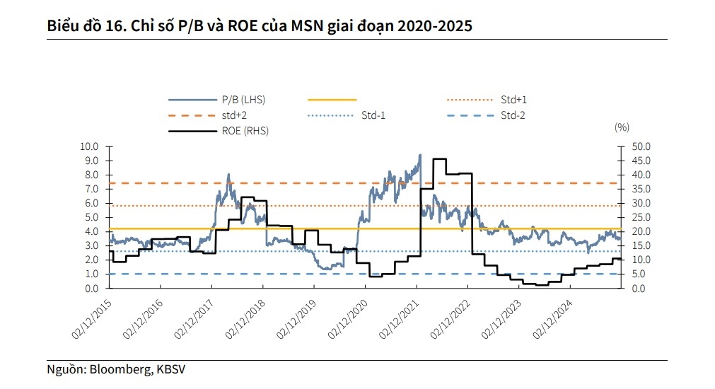 Công ty Chứng khoán KB Việt Nam (KBSV) khuyến nghị mua dành cho cổ phiếu MSN. Trong quý III/2025, doanh thu và lợi nhuận sau thuế thuộc cổ đông công ty mẹ của CTCP Tập đoàn Masan (MSN) đạt lần lượt 21.164 tỷ đồng (giảm 1,5% so với cùng kỳ) và 1.209 tỷ đồng (tăng 72%). Lũy kế 9 tháng năm 2025, doanh thu và lợi nhuận sau thuế thuộc cổ đông công ty mẹ của MSN đạt lần lượt 58.375 tỷ đồng (giảm 3%) và 2.634 tỷ đồng (tăng 101%).