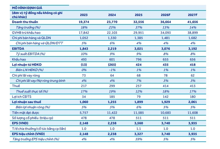 Năm 2026 được kỳ vọng sẽ đánh dấu tăng trưởng lợi nhuận của PVS. Công ty Chứng khoán ACB (ACBS) dự phóng doanh thu đạt 36.664 tỷ đồng (+12,6% so với cùng kỳ) và LNST 1.929 tỷ đồng (+1,6% so với cùng kỳ). Bằng phương pháp chiết khấu dòng tiền DCF, ACBS định giá PVS với giá mục tiêu đến cuối 2026 là 47.800 đồng/cổ phiếu. Tiềm năng tăng giá 10% từ giá hiện tại. Xếp hạng khả quan.