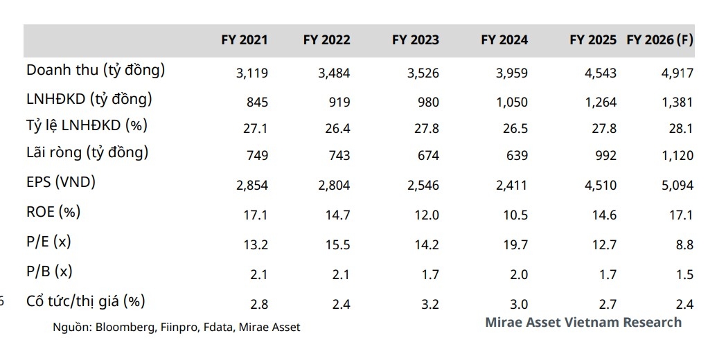 EPS forward cho năm 2026 đạt 5.094 đồng/cổ phiếu, tương ứng với mức P/E forward ở mức 8,8 lần. Do đó, Mirae Asset đánh giá tích cực cho BWE đồng thời khuyến nghị tăng tỷ trọng đối với cổ phiếu BWE.