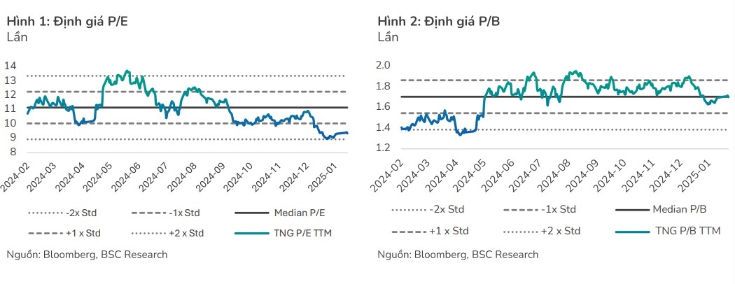 Ở thời điểm hiện tại, BSC đưa ra khuyến nghị mua đối với cổ phiếu TNG với giá mục tiêu = 25.500 đồng/cổ phiếu (+21% so với giá ngày 21/1, +19% so với giá mục tiêu cũ) dựa trên quan điểm sau: TNG đang được giao dịch ở mức giá hấp dẫn PE FW 2026 = 6.5 lần so với trung bình 5 năm = 8.5 lần và trung bình ngành may mặc = 9 lần và triển vọng đơn hàng 2026 được đảm bảo và vượt trội hơn so với các doanh nghiệp cùng ngành khác nhờ chủ động đa dạng hóa tập khách hàng giảm phụ thuộc vào thị trường Mỹ và trong bối cảnh tình hình thuế quan đã có hiệu lực, các nhãn hàng tại Mỹ vẫn chưa đưa ra yêu cầu đặc biệt nào khi đặt hàng và mức độ đặt hàng vẫn duy trì ổn định. 2.