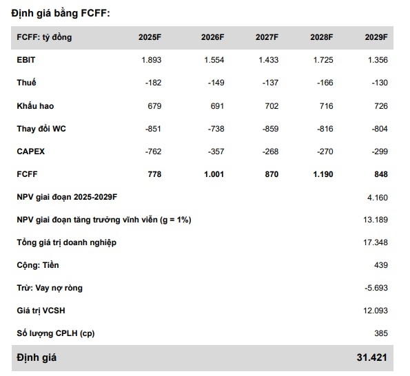 VCBS đưa ra mức giá khuyến nghị là 31.519 đồng/cổ phiếu, tương đương với P/E mục tiêu đạt 8,1x dựa trên 2 phương pháp chiết khấu FCFF và so sánh P/E với tỷ trọng 70/30.